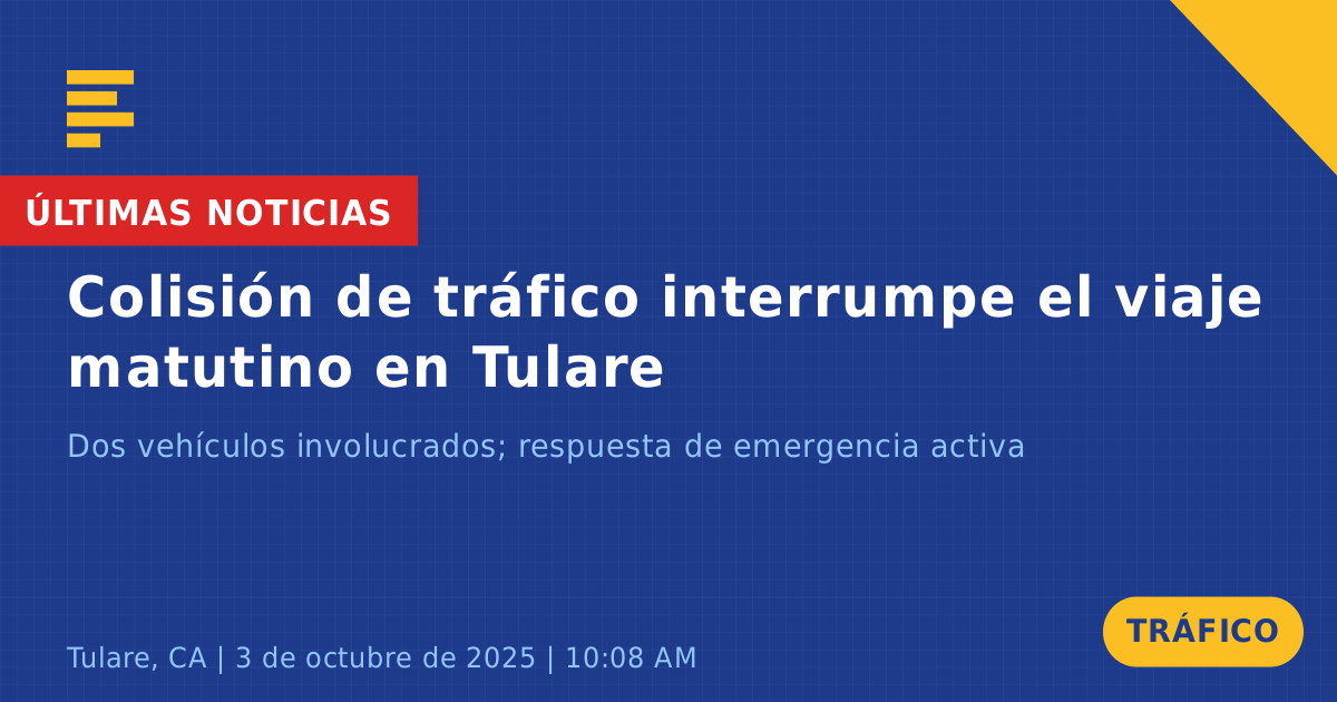 Un accidente de tráfico ocurrió hoy en la intersección de Road 140 y Avenue 224 en Tulare, CA, involucrando a dos vehículos: un Toyota Prius blanco y un camión utilitario blanco y verde. El incidente tuvo lugar durante la mañana, lo que llevó a cierres temporales de carriles mientras las unidades de emergencia llegaban para gestionar la escena y dirigir el tráfico.