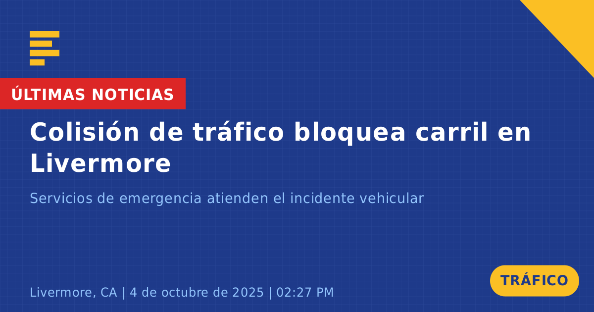 Un accidente de tráfico ocurrió hoy en la intersección de Arroyo Road y Wetmore Road en Livermore, CA, involucrando un vehículo, un Toyota Prius gris, que chocó contra un puente. El incidente fue reportado alrededor de las 2:28 PM, lo que provocó el bloqueo del carril derecho, lo que se espera cause retrasos y congestión para los conductores en la zona.