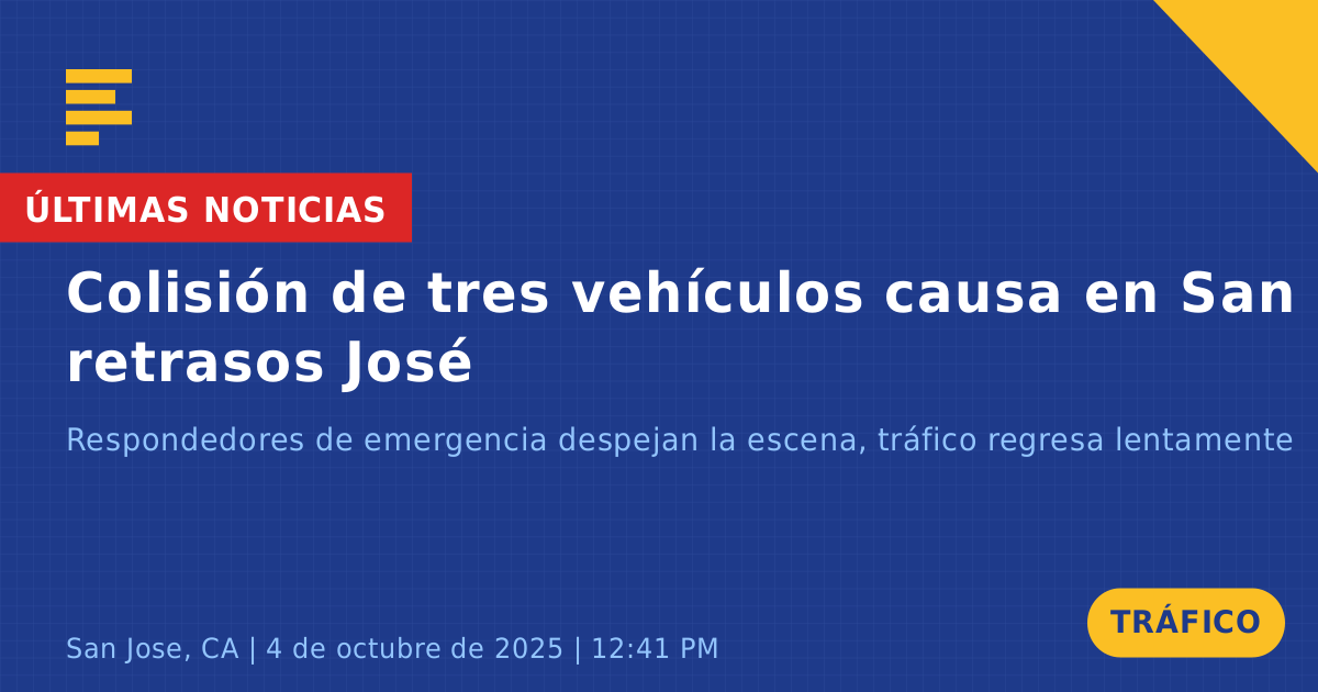 Una colisión de tráfico en la Interestatal 680 Norte en San José, CA, ha causado retrasos durante la hora pico de la tarde hoy. El incidente involucró a tres vehículos: un Tesla gris, un vehículo blanco y un Chevrolet plateado. La colisión ocurrió alrededor de las 12:42 PM, bloqueando inicialmente el carril lento y provocando un flujo de tráfico lento en la zona.