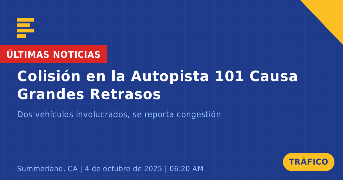 Un accidente de tráfico que involucró a dos vehículos ocurrió esta mañana en la Carretera U.S. 101 Norte en Evans Avenue, en Summerland, CA. El incidente, reportado alrededor de las 6:21 AM, involucró a un Ford Explorer negro y a una Dodge Ram blanca, ambos de los cuales sufrieron daños y requirieron ser remolcados del lugar.