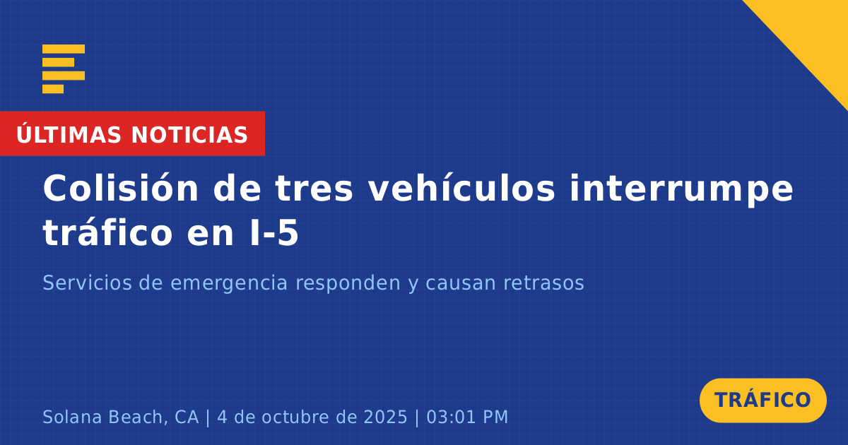 Un accidente de tráfico que involucró a tres vehículos ocurrió hoy en la Interestatal 5 Sur cerca de Via De La Valle en Solana Beach, CA. El incidente se reportó aproximadamente a las 3:02 PM, cuando un perro pequeño cruzó los carriles, provocando una colisión entre un Porsche blanco, un Honda negro y un Lexus azul.