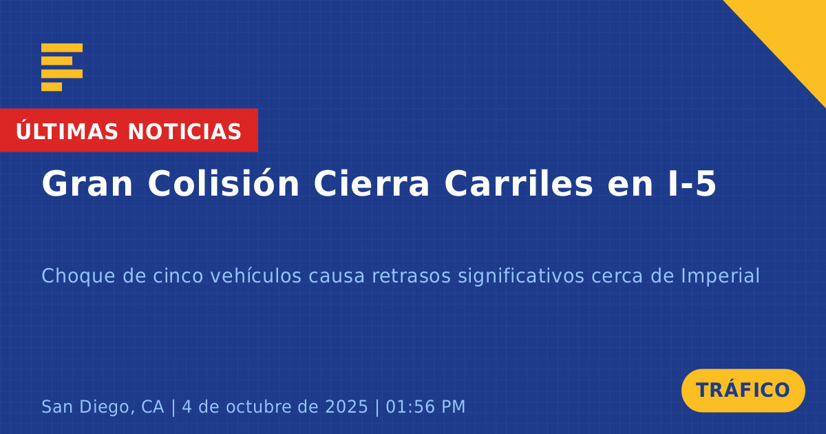 Un accidente de tráfico ocurrió hoy en la Interestatal 5 Sur (I-5 S) cerca de Imperial en San Diego, CA, involucrando a cinco vehículos. El incidente tuvo lugar alrededor de la 1:57 PM e incluyó un Kia Sportage negro, una Toyota Tundra blanca, un Jeep azul, un camión blanco y una furgoneta.