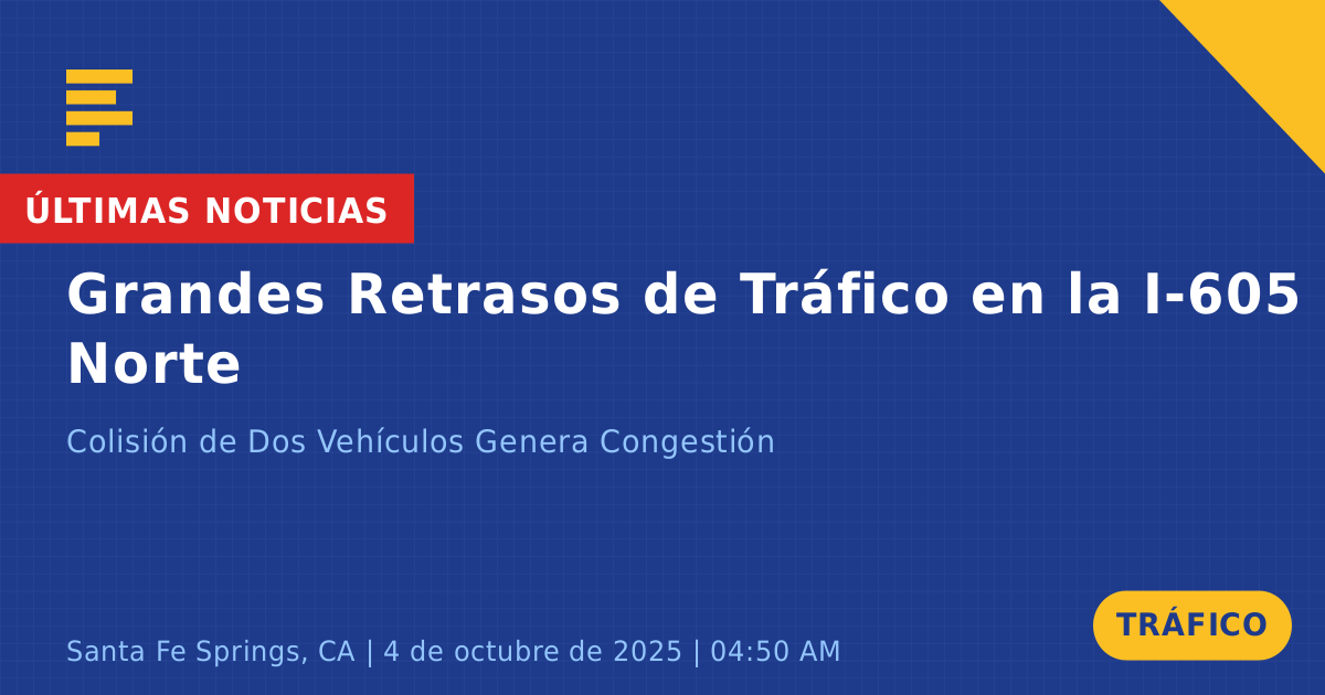 Una colisión de tráfico en la Interestatal 605 Norte en Santa Fe Springs, CA, ha provocado importantes retrasos en el tráfico esta mañana. El incidente, que ocurrió hoy, involucró a dos vehículos, incluyendo uno que estaba remolcando un tráiler de equipo de construcción. Como resultado de la colisión, los carriles uno a cuatro quedaron completamente detenidos, causando una considerable congestión durante la ajetreada hora pico de la mañana.