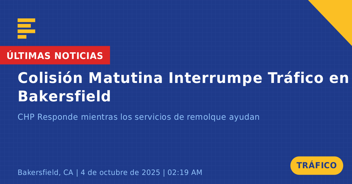 Un accidente de tráfico ocurrió hoy aproximadamente a las 2:20 AM en la Ruta Estatal 43 cerca de Panama Lane en Bakersfield, CA, involucrando a dos vehículos: un Hyundai Sonata negro y un vehículo desconocido. La Patrulla de Caminos de California (CHP) respondió a la escena para gestionar las condiciones del tráfico tras el incidente.