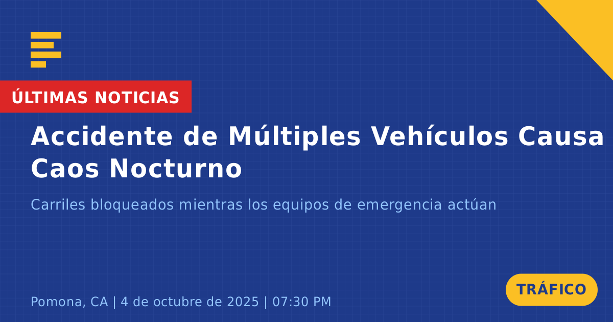 Un accidente de tráfico que involucró a tres vehículos ocurrió hoy en la intersección de la Ruta Estatal 71 Norte e la Interestatal 10 Oeste en Pomona, CA. El incidente fue reportado alrededor de las 7:31 PM, bloqueando varios carriles y causando una interrupción significativa en el tráfico durante la hora pico de la tarde.