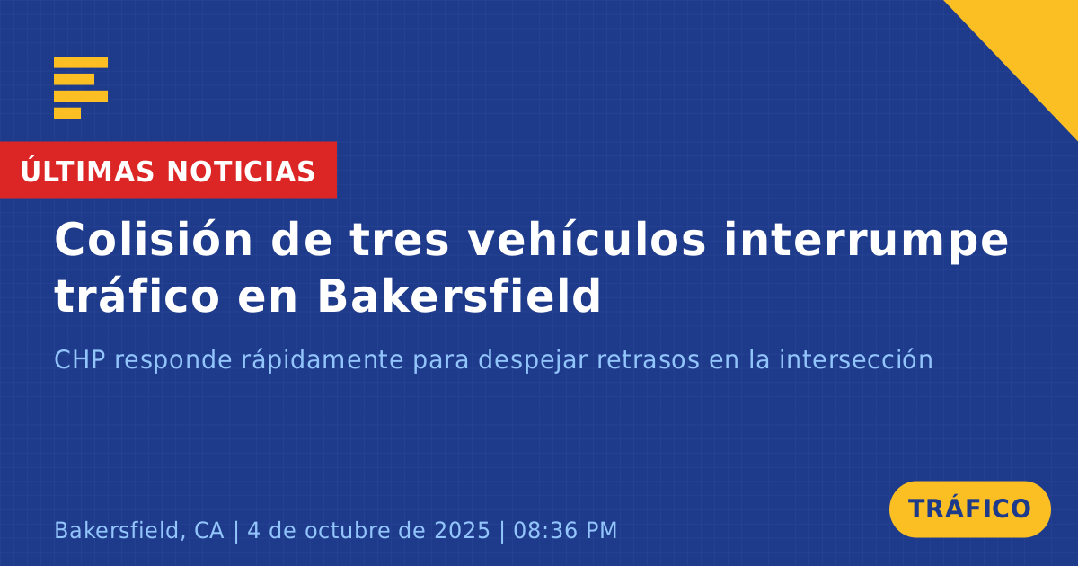 Un accidente de tráfico que involucró a tres vehículos ocurrió hoy en la intersección de Shalimar Drive y Niles Street en Bakersfield, CA. El incidente fue reportado alrededor de las 8:43 PM, lo que llevó a una rápida respuesta de la Patrulla de Carreteras de California (CHP), que despachó múltiples unidades para gestionar la escena y dirigir el tráfico.