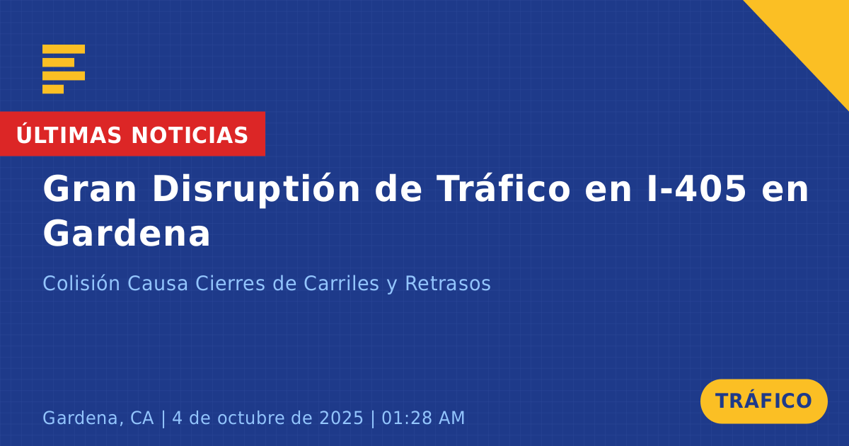 Una colisión de tráfico en la Autopista 405 Sur en Gardena, CA, ha causado importantes interrupciones en el tráfico hoy. El incidente, que involucra a dos vehículos, ocurrió esta mañana alrededor de la 1:30 AM. Uno de los vehículos fue identificado como un sedán de cuatro puertas de color oscuro, mientras que los detalles sobre el segundo vehículo no están especificados.