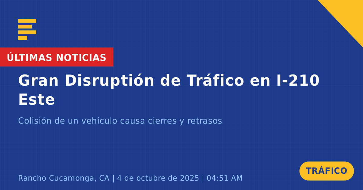 Una colisión de tráfico en la Interestatal 210 Este cerca de la Avenida Archibald en Rancho Cucamonga, CA, ha provocado importantes interrupciones en el tráfico hoy. El incidente, que involucró un solo vehículo—un Kia plateado—ocurrió esta mañana alrededor de las 4:52 AM. El vehículo perdió el control y terminó en el divisor central, dejando escombros esparcidos por la carretera.