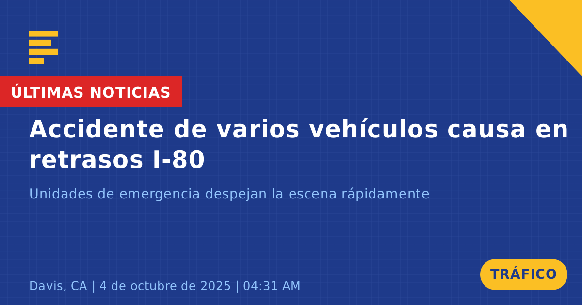 Un accidente de tráfico que involucró a tres vehículos ocurrió hoy en la Interestatal 80 Este cerca de la salida de Chiles Road en Davis, CA. El incidente tuvo lugar en las primeras horas de la mañana, involucrando un Honda azul, un Toyota Prius azul y un Nissan Altima gris. Las unidades de respuesta de emergencia llegaron rápidamente al lugar para gestionar la situación y dirigir el tráfico.