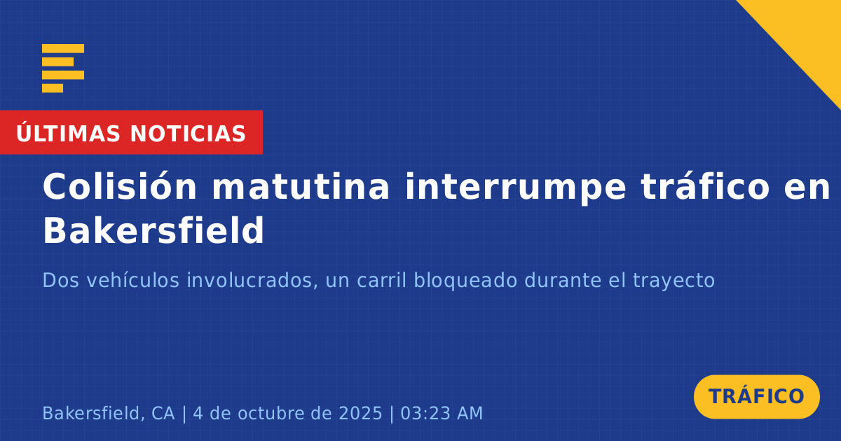 Una colisión de tráfico en la salida de 7th Standard Road en Bakersfield, CA, causó importantes interrupciones en el tráfico esta mañana. El incidente, que ocurrió alrededor de las 3:24 AM, involucró a dos vehículos, uno de los cuales reportó que se le había salido una llanta. Esta situación resultó en al menos un carril bloqueado, lo que provocó retrasos para los automovilistas durante la hora pico de la mañana.