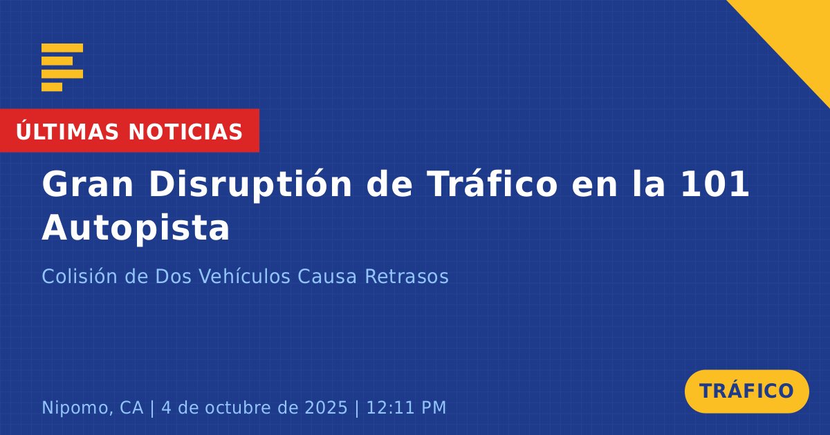 Una colisión de tráfico en la Autopista 101 Sur en Nipomo, CA, causó importantes interrupciones en el flujo de tráfico hoy alrededor del mediodía. El incidente involucró a dos vehículos: un Chevrolet Cruz blanco y un BMW. La colisión ocurrió aproximadamente a las 12:15 PM, y se informó que el BMW necesitaba servicios de remolque, mientras que el Chevrolet Cruz pudo moverse fuera de la carretera.