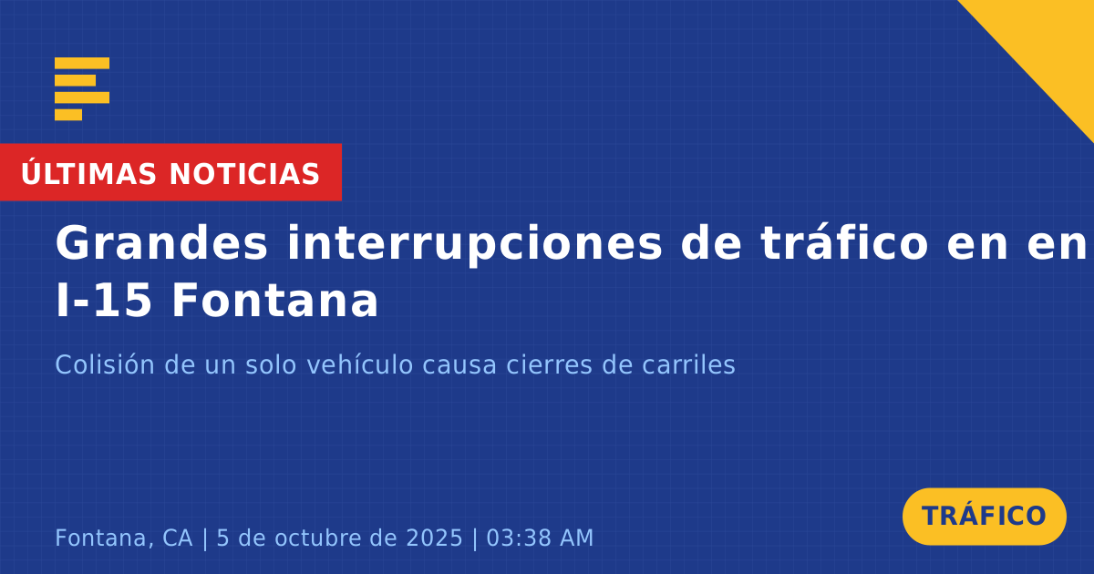 Una colisión de tráfico en la Interestatal 15 Sur cerca de la Interestatal 210 en Fontana, CA, causó un impacto significativo en el tráfico hoy. El incidente ocurrió temprano esta mañana, aproximadamente a las 3:41 AM, involucrando un solo vehículo, un BMW blanco, que fue confirmado en la escena. Las unidades de respuesta de emergencia llegaron rápidamente para gestionar la situación y garantizar la seguridad en la carretera.