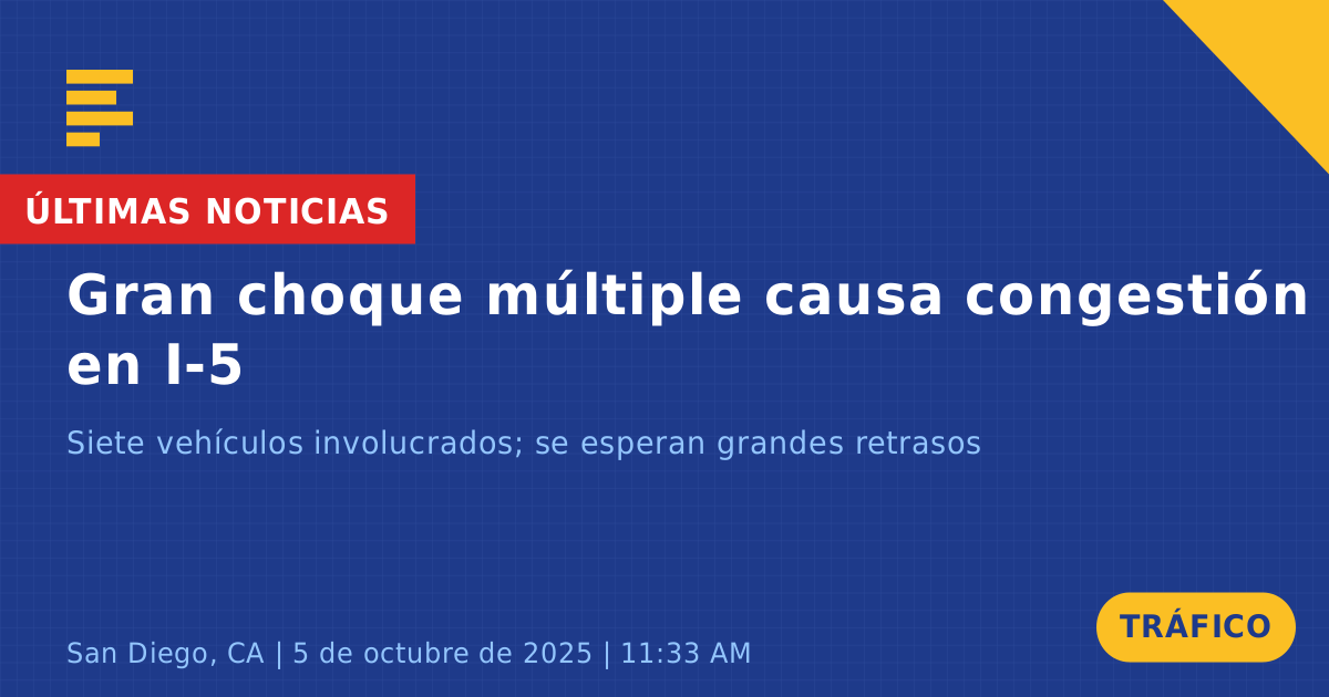 Un importante accidente de tráfico ocurrió hoy en la Interestatal 5 Norte (I-5 N) cerca de Carmel Mountain South en San Diego, CA, involucrando un total de siete vehículos. El incidente fue reportado aproximadamente a las 11:32 AM durante la concurrida hora pico de la mañana, causando considerables interrupciones en el tráfico.