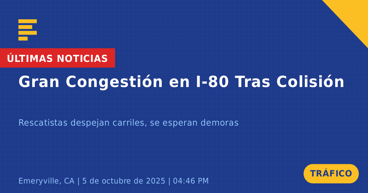 Un accidente de tráfico que involucró a dos vehículos ocurrió hoy en la Interestatal 80 Este en la Avenida Ashby en Emeryville, CA. El incidente, que involucró una camioneta Dodge negra y una Ram 1500 negra, provocó bloqueos significativos de carriles y congestión del tráfico durante las horas de la tarde.