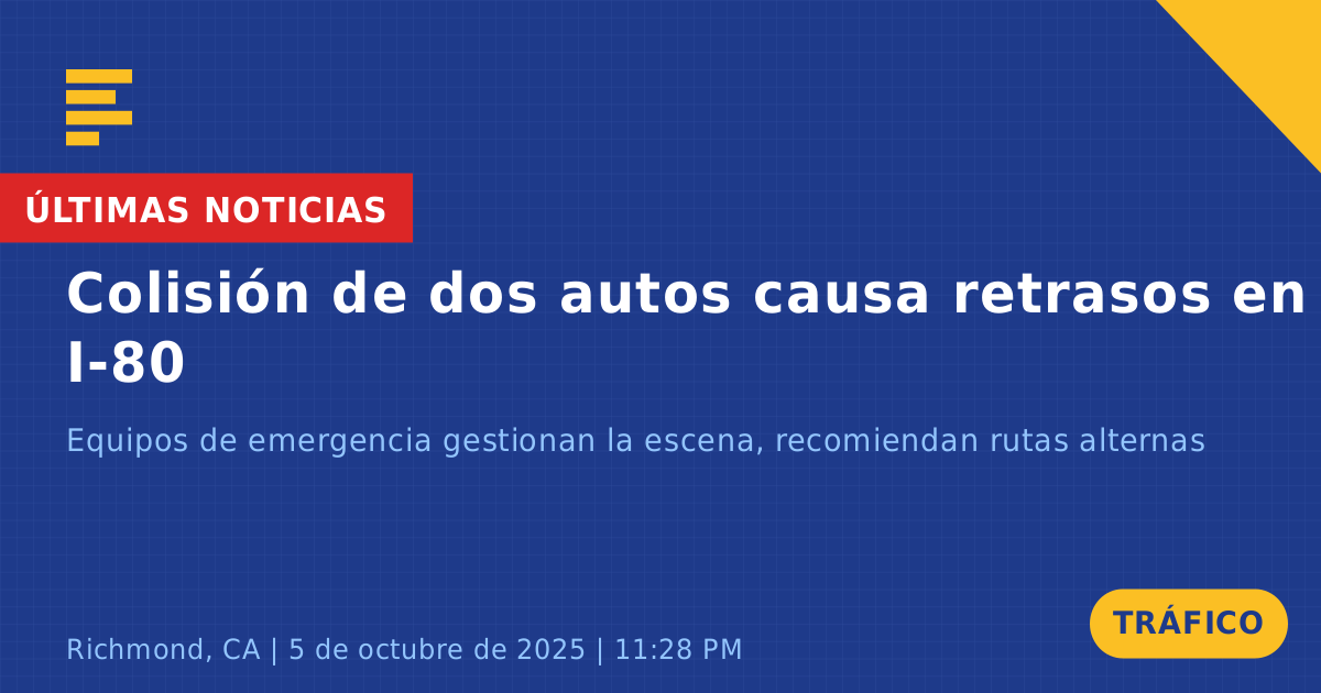 Un choque de tráfico que involucró a dos vehículos ocurrió hoy en la Interestatal 80 Este en la salida de Carlson Boulevard en Richmond, CA. El incidente tuvo lugar alrededor de las 11:28 PM e involucró a un sedán Lexus gris y a un sedán Tesla de color oscuro. La colisión resultó en el bloqueo de uno a dos carriles, lo que provocó retrasos y congestión para los automovilistas en la zona.