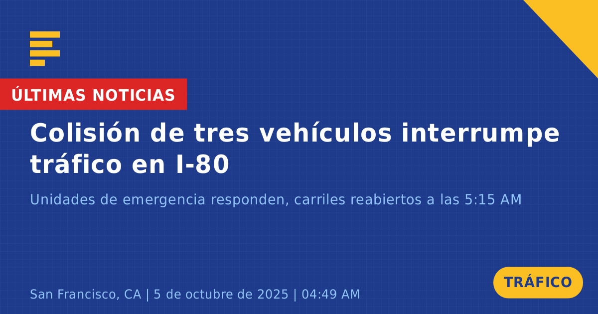 Un accidente de tráfico que involucró a tres vehículos ocurrió hoy en la Interestatal 80 Oeste, cerca de la salida de Treasure Island en San Francisco, CA. El incidente tuvo lugar durante las primeras horas de la mañana, causando interrupciones significativas en el flujo de tráfico.