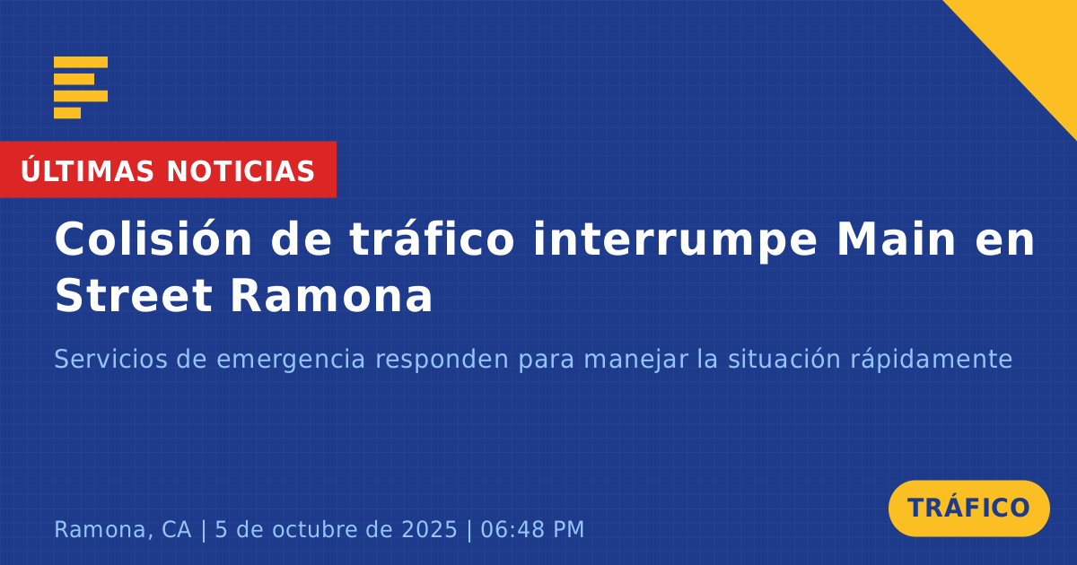 Un accidente de tráfico ocurrió hoy a las 6:49 PM en la Calle Main en Ramona, CA, involucrando a dos vehículos: una camioneta Ford F15 blanca y un sedán Hyundai de cuatro puertas de color gris o azul. La colisión bloqueó temporalmente el carril de autos en un establecimiento cercano, lo que llevó a una respuesta de los servicios de emergencia para gestionar la situación.