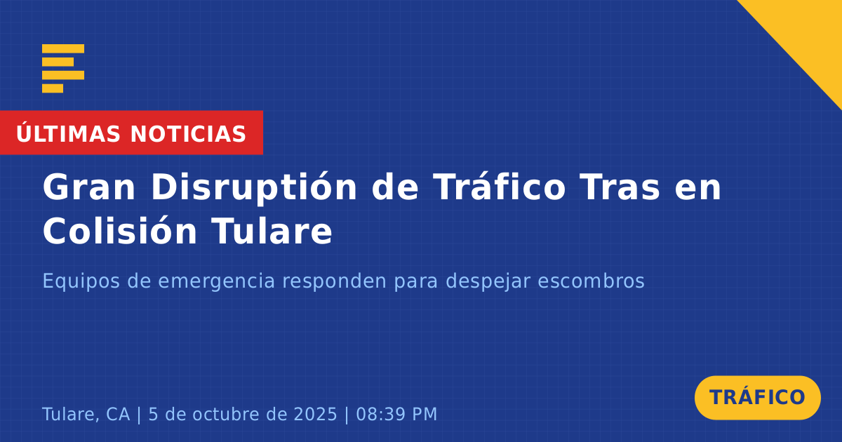 Un accidente de tráfico ocurrió hoy en la intersección de Road 68 y Avenue 232 en Tulare, CA, involucrando a dos vehículos: un camión de carga con remolque y un vehículo blanco. El incidente se reportó alrededor de las 8:40 PM y resultó en importantes interrupciones del tráfico en la zona.