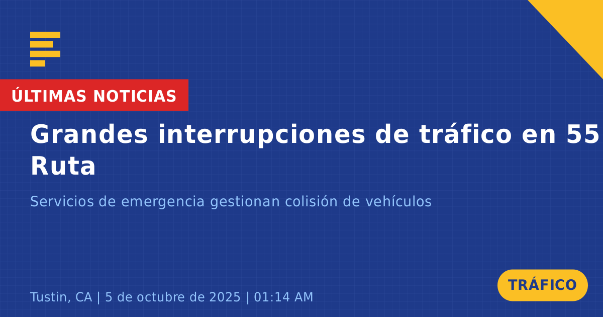 Una colisión de tráfico en la Ruta Estatal 55 Sur en Tustin, CA, ha causado importantes interrupciones en el tráfico hoy. El incidente ocurrió alrededor de la 1:15 AM, involucrando a dos vehículos: un Tesla blanco y un Kia. El Tesla se encontraba en posición lateral en el carril, mientras que el Kia requería ser remolcado debido a su estado.