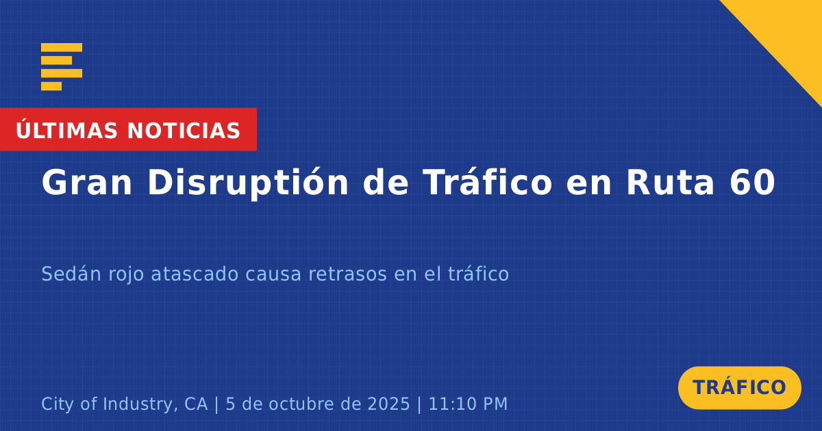Un accidente de tráfico ocurrió hoy en la Ruta Estatal 60 Oeste cerca de la carretera Fullerton en la Ciudad de Industry, CA, provocando importantes interrupciones en el tráfico. Aproximadamente a las 11:10 PM, un sedán rojo salió de la carretera y quedó atascado en los arbustos a lo largo de la pendiente, haciendo que el vehículo no pudiera ser conducido.