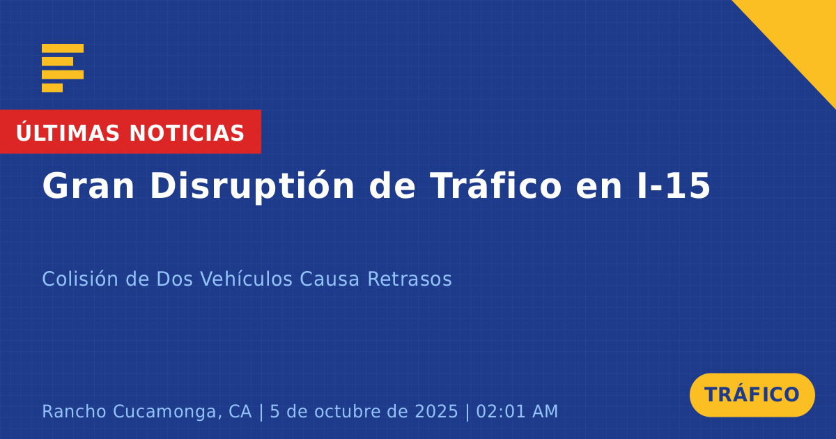 Una colisión de tráfico en la Interestatal 15 Norte cerca de Foothill Boulevard en Rancho Cucamonga, CA, causó importantes interrupciones en el tráfico hoy. El incidente ocurrió alrededor de las 2:01 AM e involucró a dos vehículos: un SUV Cadillac negro y un Chevrolet Tahoe azul.