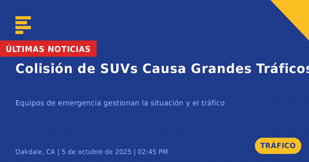 Hoy se produjo una colisión de tráfico que involucró a dos SUV blancos en la Ruta Estatal 108 (SR-108) en la intersección con Kennedy Road en Oakdale, CA. El incidente fue reportado alrededor de las 2:46 PM y resultó en importantes interrupciones del tráfico durante la hora pico de la tarde.