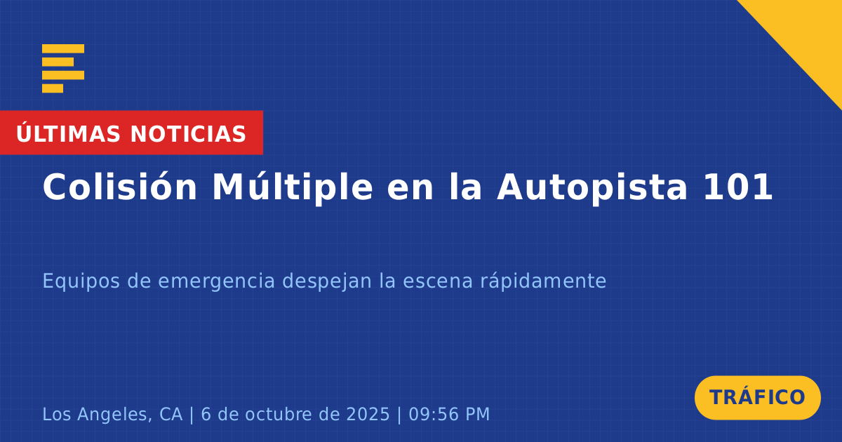 Un accidente de tráfico ocurrió hoy en la autopista US 101 Norte, cerca de la salida de Silver Lake Boulevard en Los Ángeles, CA, involucrando a seis vehículos. El incidente tuvo lugar alrededor de las 9:57 PM e incluyó un Subaru azul, un Hyundai Elantra negro y un camión semi entre los vehículos implicados.