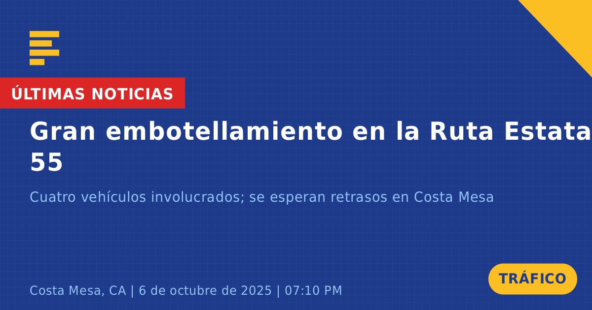 Una colisión de tráfico en la Ruta Estatal 55 Norte en Costa Mesa, CA, causó importantes interrupciones en el tráfico hoy durante la hora pico de la tarde. El incidente ocurrió alrededor de las 7:12 PM e involucró cuatro vehículos: un Audi blanco, un Tesla plateado, un Toyota Camry gris y un Nissan Altima blanco.