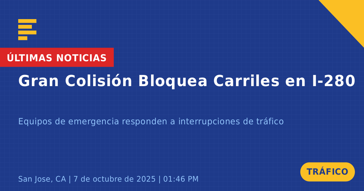 Un accidente de tráfico que involucró a cuatro vehículos ocurrió hoy en la autopista 280 Sur (I-280) en la intersección con la Avenida Meridian en San José, CA. El incidente fue reportado aproximadamente a la 1:47 PM e involucró un vehículo negro, un Toyota, un Volkswagen y un SUV Chevrolet.