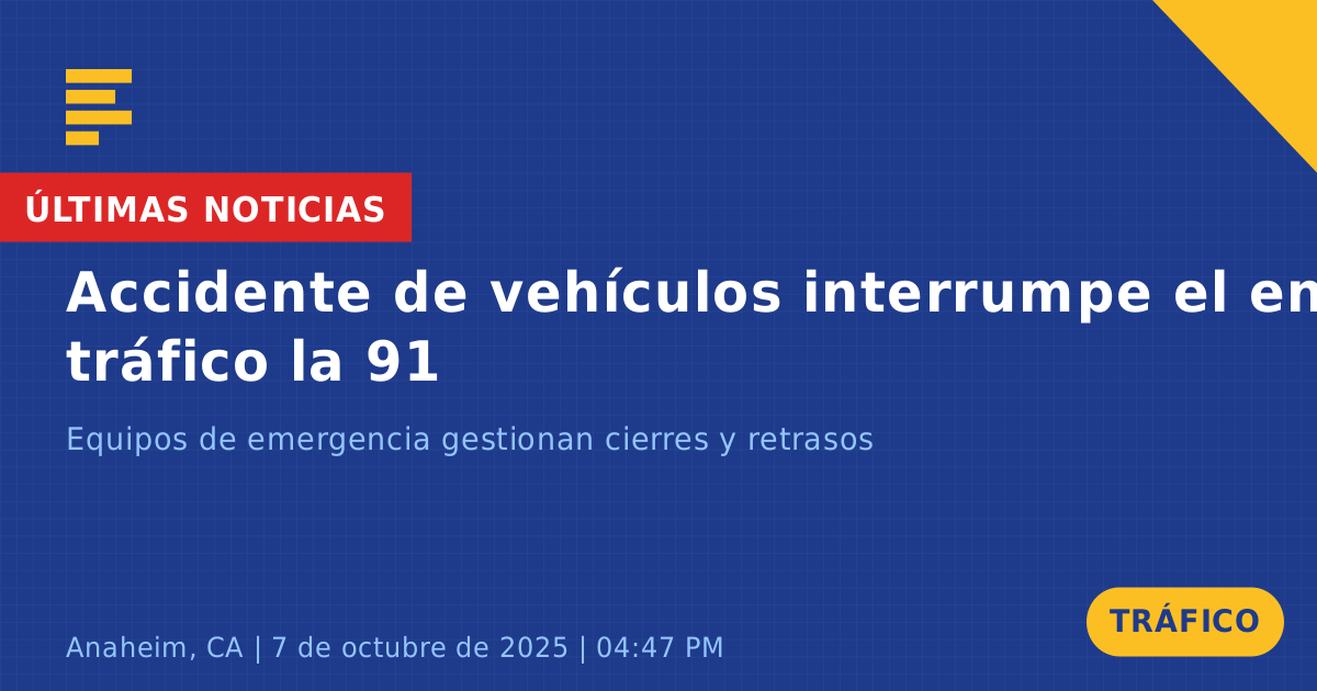 Un accidente de tráfico ocurrió hoy en la Autopista 91 Oeste en Anaheim, CA, involucrando a cinco vehículos, incluyendo un Toyota RAV4 gris, una Ford F250 blanca y otra camioneta Ford blanca. El incidente tuvo lugar alrededor de las 4:48 PM, causando interrupciones significativas durante la hora pico de la tarde.