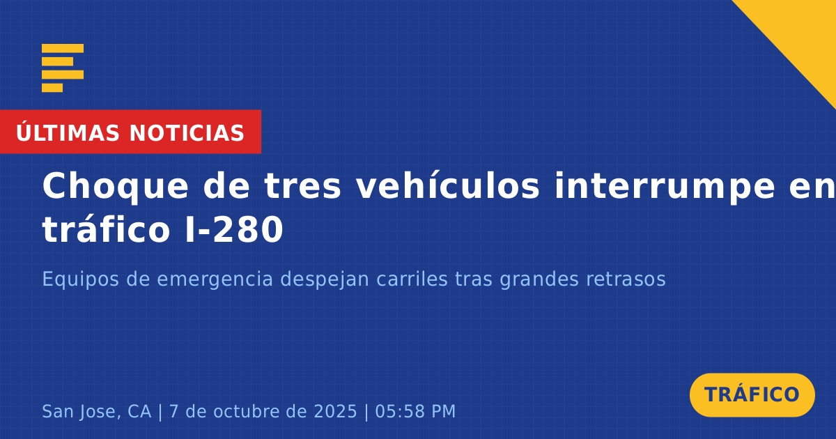 Un accidente de tráfico que involucró a tres vehículos, incluido una camioneta Chevrolet blanca, ocurrió hoy en la Interestatal 280 Norte cerca de Saratoga Avenue en San José, CA. El incidente fue reportado alrededor de las 6:02 PM y causó interrupciones significativas en el tráfico, bloqueando especialmente los carriles tres y cuatro.