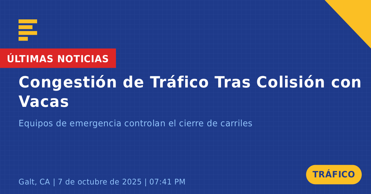 Un accidente de tráfico ocurrió hoy en la intersección de McKenzie Road y Mingo Road en Galt, CA, involucrando un vehículo, una camioneta Silverado. El incidente se reportó aproximadamente a las 7:41 PM y se complicó por la presencia de varias vacas que habían salido a la carretera, creando una situación peligrosa para los conductores.