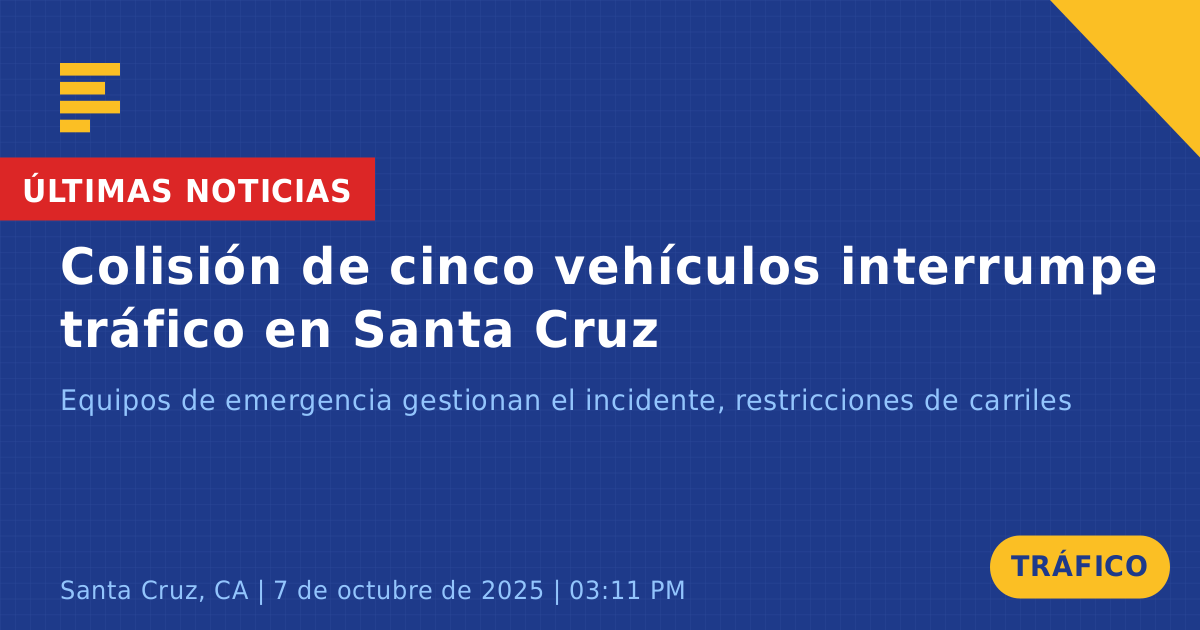 Un accidente de tráfico ocurrió hoy en la Ruta Estatal 17 Norte en la Ruta Estatal 1 Norte en Santa Cruz, CA, involucrando cinco vehículos. El incidente fue reportado alrededor de las 3:11 PM, y un vehículo sufrió daños significativos, requiriendo servicios de remolque. Como resultado, los vehículos se ubicaron en el arcén derecho, lo que llevó a restricciones temporales de carriles que impactaron el flujo de tráfico en la zona.
