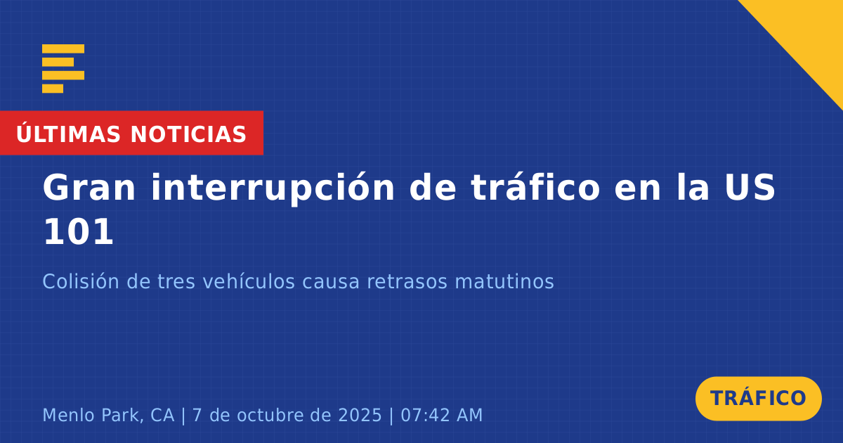 Una colisión de tráfico en la Autopista 101 Norte en Menlo Park, CA, causó importantes interrupciones en el flujo de tráfico durante la mañana de hoy. El incidente involucró a tres vehículos: un Mazda gris, un Toyota gris y un vehículo desconocido.