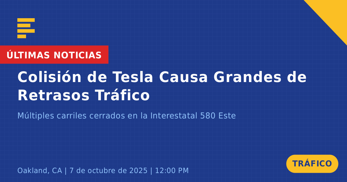 Una colisión de tráfico en la Interestatal 580 Este en Oakland, CA, causó retrasos significativos hoy. El incidente, que involucró un vehículo—un Tesla de flota de club—ocurrió poco después del mediodía. Como resultado de la colisión, se cerraron varios carriles, lo que provocó congestiones y retrasos que oscilaron entre aproximadamente 10 y 45 minutos.