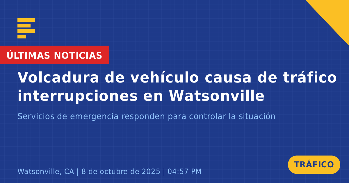 Un accidente de tráfico ocurrió hoy en la intersección de Holohan Road y la Ruta Estatal 152 en Watsonville, CA, involucrando un solo vehículo que salió de la carretera y terminó boca arriba en una zanja. El incidente se reportó aproximadamente a las 4:57 PM, lo que provocó una respuesta inmediata de los servicios de emergencia para gestionar la escena.