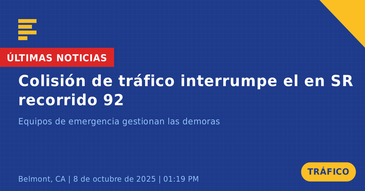 Una colisión de tráfico en la Ruta Estatal 92 (SR 92) en Belmont, CA, ha causado importantes interrupciones en el flujo de tráfico hoy. El incidente, que involucró a dos vehículos: una Nissan Xterra plateada y un Honda gris, ocurrió alrededor de la 1:19 PM durante la concurrida hora de la tarde.